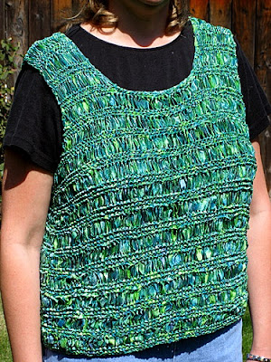 Here is my finished Vest. It's doesn't have much shape to it and I am not all that happy with the way it looks on me. I think I will try it with a collared shirt and wear it as a vest when the weather cools. Knitted with Lion Brand Incredible Ribbon Yarn.